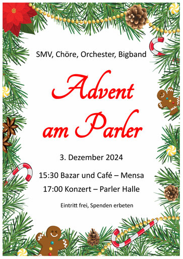 Das Parler-Gymnasium lädt am Dienstag, den 3.12.2024 ab 15:30 Uhr herzlich zu seiner Adventsfeier ein. Beim winterlichen Bazar der SMV können die Besucher Selbstgebackenes und Selbstgebasteltes