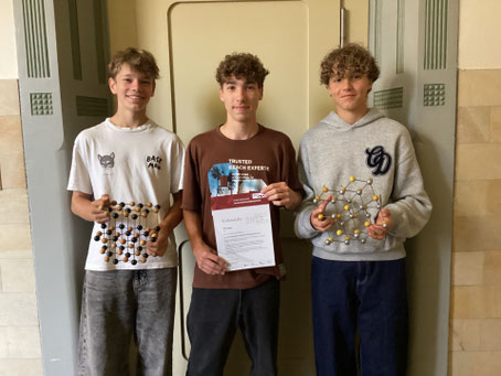 Drei Schüler der Klasse 9a haben in diesem Schuljahr an der 22. Internationalen JuniorScienceOlympiade teilgenommen. Bei diesem Wettbewerb müssen theoretische und experimentelle Aufgaben aus den Bereichen Biologie, Chemie und Physik gemeistert werden. Der Wettbewerb gliedert sich in vier Runden. Bei der ersten Runde haben 3700 Schülerinnen und Schüler teilgenommen. Jonas Krug hat es, als einer von ca. 1000 Personen in die zweite Runde geschafft. Nur 350 der 3700 Teilnehmenden waren noch erfolgreicher und sind in die 3. Runde des Wettbewerbs gekommen. Mit dabei waren auch Mika Bayer und Moritz Bolsinger. Herzlichen Glückwunsch!