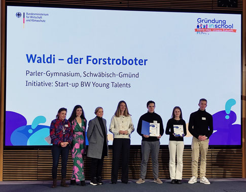 Das Schülerteam des Start-ups „Waldi-der Forstroboter“ vom Parler-Gymnasium hat beim Wettbewerb „Young Talents“ 2024 beeindruckende Erfolge erzielt. Mit ihrer innovativen Idee setzten sich Carla Dinser, Janno Klumpp, Manuel Rasch, Marie Niku und Pia Friedl gegen zahlreiche Mitbewerber aus ganz Baden-Württemberg durch und erreichten das große Finale in Berlin. Neben der Ehre erhielten sie eine Preisgeldsumme von 500 Euro sowie eine Einladung ins Bundesministerium für Wirtschaft und Klimaschutz.