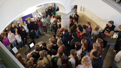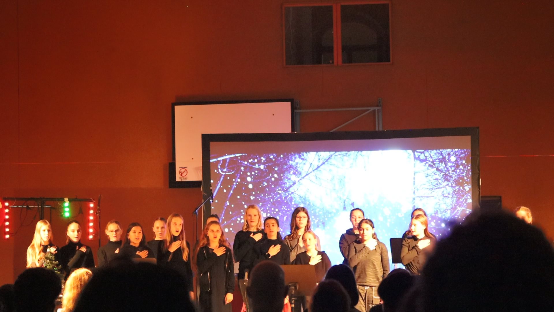 Einstimmen auf die Weihnachtszeit, stimmungsvoll die Pause verbringen, als Gemeinschaft sich auf die freien Tage freuen – der Chor überraschte mit einem kleinen Konzert in der Pause.