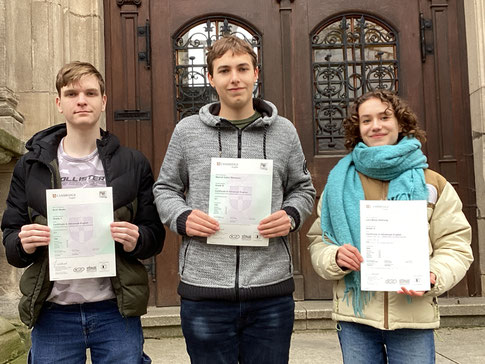 Pünktlich zur weihnachtlichen Bescherung haben die drei Parler Schüler Kyrill Weder, Marcel Mészáros und Lara-Maria Gehrung (s. Bild v.l.) ihre Urkunden für die erfolgreiche Teilnahme an der Cambridge C1 Zertifizierung erhalten. Die Prüfung fand am 19. Oktober an einem Prüfungszentrum in Stuttgart statt. Zuvor haben sich die Schüler ein ganzes Schuljahr lang im Rahmen einer Arbeitsgemeinschaft (AG) am Parlergymnasium auf diese anspruchsvolle Prüfung vorbereitet. Ihr Engagement und ihre harte Arbeit wurden nun mit diesem bedeutenden Erfolg belohnt.