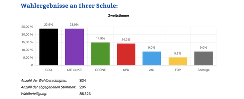 Das Wahlergebnis zeigt eine Stimmengleichheit an der Spitze: Sowohl die CDU als auch DIE LINKE erhielten jeweils 23,9 % der Stimmen. Die GRÜNEN folgen mit 14,9 %, knapp vor der SPD mit 14,2 %.